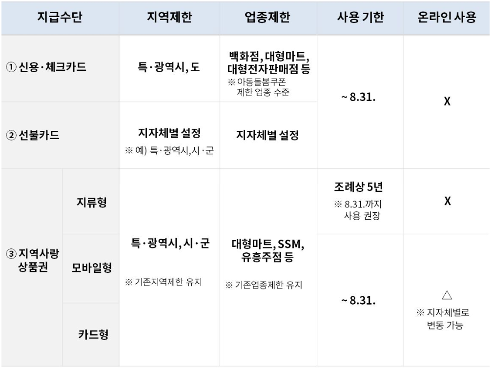 ○ 신용·체크카드에 충전된 긴급재난지원금, 선불카드, 지역사랑상품권(모바일형·카드형)은 8.31.(월)까지 사용할 수 있습니다.