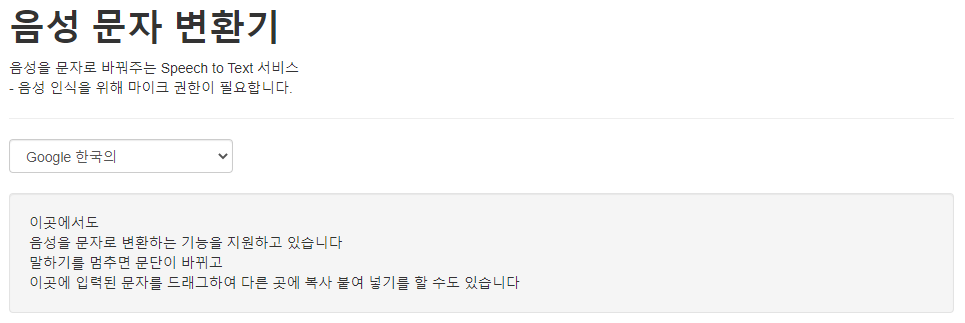 사용 방법은 별도의 시작 버튼이 없이 바로 페이지 접속만으로 음성 문자 변환이 가능합니다. 단, 이 곳 역시 크롬 브라우저를 통해서 사용이 가능하고 최초 접속시 팝업으로 마이크 권한 허용을 묻는 창이 뜨는데 이 때 허용을 눌러주셔야 합니다.