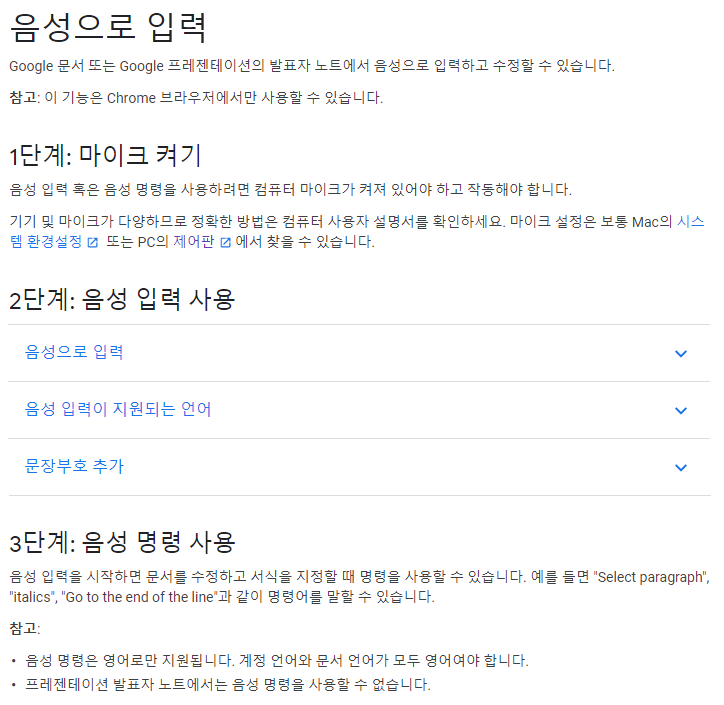 위 내용은 구글의 문서 편집기 고객센터에 나와있는 음성으로 문자 입력하는 방법에 대한 설명입니다. 음성을 문자로 변환하기 위해서는 구글 문서 또는 구글 프레젠테이션의 발표자 노트에서 음성 입력을 할 수 있습니다. 중요한 건 크롬 익스플로러에서만 지원을 하며 인터넷 익스플로러 등 다른 브라우저에서는 음성을 글자로 변환 기능을 지원하지 않습니다.