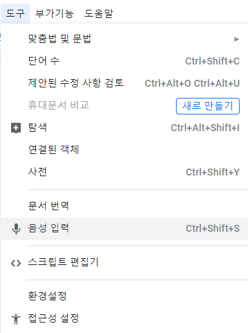 구글 문서를 실행하고 상단 메뉴에서 도구-음성 입력을 선택하거나 컨트롤+쉬프트+S 버튼으로 음성입력 메뉴를 활성화시킬 수 있습니다.