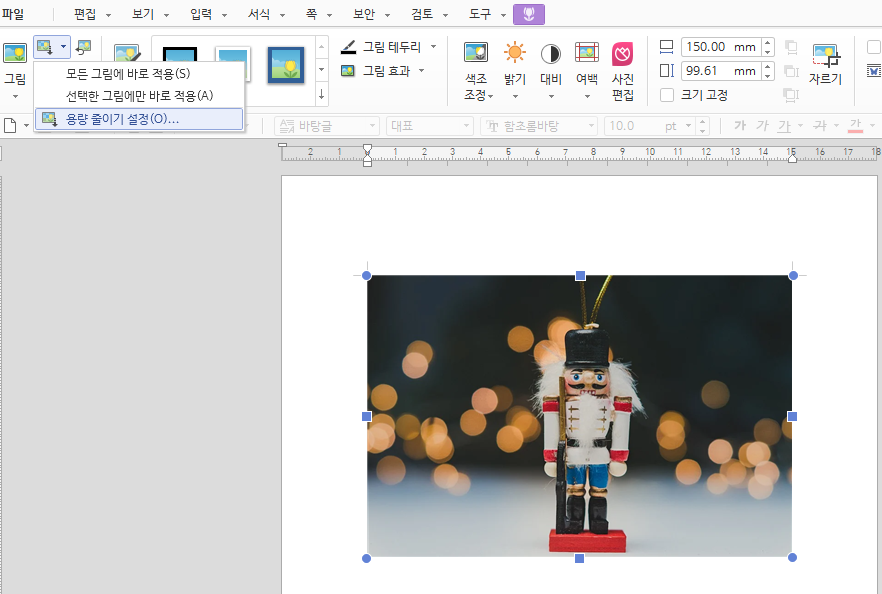 문서에서 사진을 마우스로 선택하면 상단 메뉴 우측끝에 그림 메뉴가 생기고 왼쪽 아이콘을 눌러보면 '용량 줄이기 설정' 메뉴가 나옵니다.