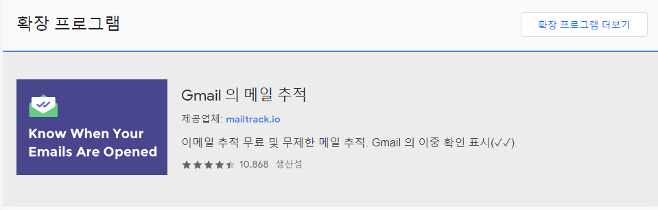 검색창에 mailtrack을 검색한 뒤 나오는 Gmail의 메일 추적이라 보여지는 위 확장프로그램을 크롬 브라우저에 설치해주시면 됩니다. 설치 방법은 우측에 있는 Chrome에 추가 버튼을 클릭해주면 간단하게 설치가 되고 이제 지메일 수신확인이 가능해집니다.