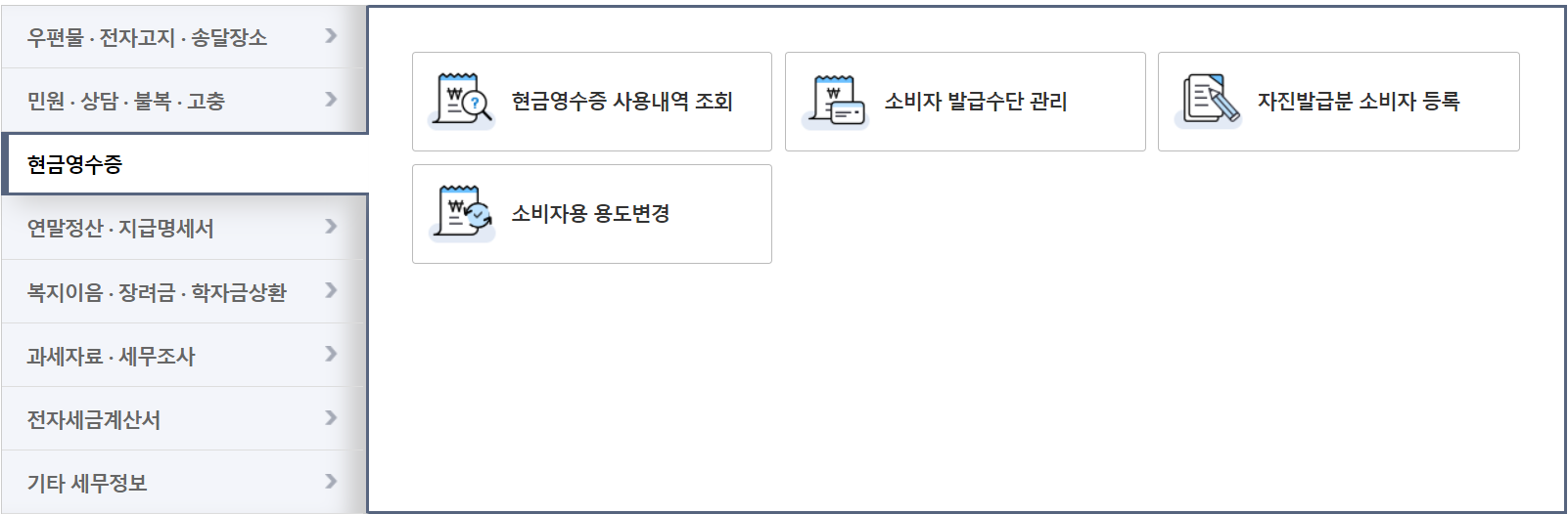 등록된 전화번호를 변경하려면 국세청 홈텍스에 로그인하고 My홈택스 > 현금영수증 화면으로 이동한 뒤 '소비자 발급수단 관리' 메뉴로 이동해야 합니다.