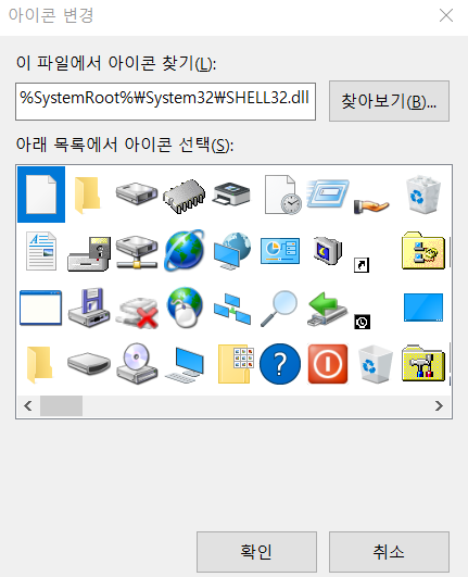 변경을 원하는 아이콘 위에서 마우스 오른쪽 클릭을 하면 하단 메뉴 중 속성을 선택한 뒤 아이콘 변경 버튼을 눌러 다른 아이콘으로 바꿀 수가 있습니다. 다음으로 보이는 창에서 윈도우 기본 아이콘들을 볼 수 있는데 여기에서 고를 수 있는 아이콘의 종류가 한정되어있어 다른 아이콘을 찾으려면 창 상단 찾아보기 버튼을 눌러 다음과 같은 파일을 열어주면 됩니다.
