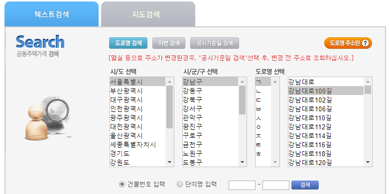 공시지가 조회 방법은 두 가지가 있는데, 시/도 선택부터 세부 주소 입력을 통해 조회하는 텍스트 검색방법이 경우에 따라서는 더 익숙하실 수 있겠습니다.