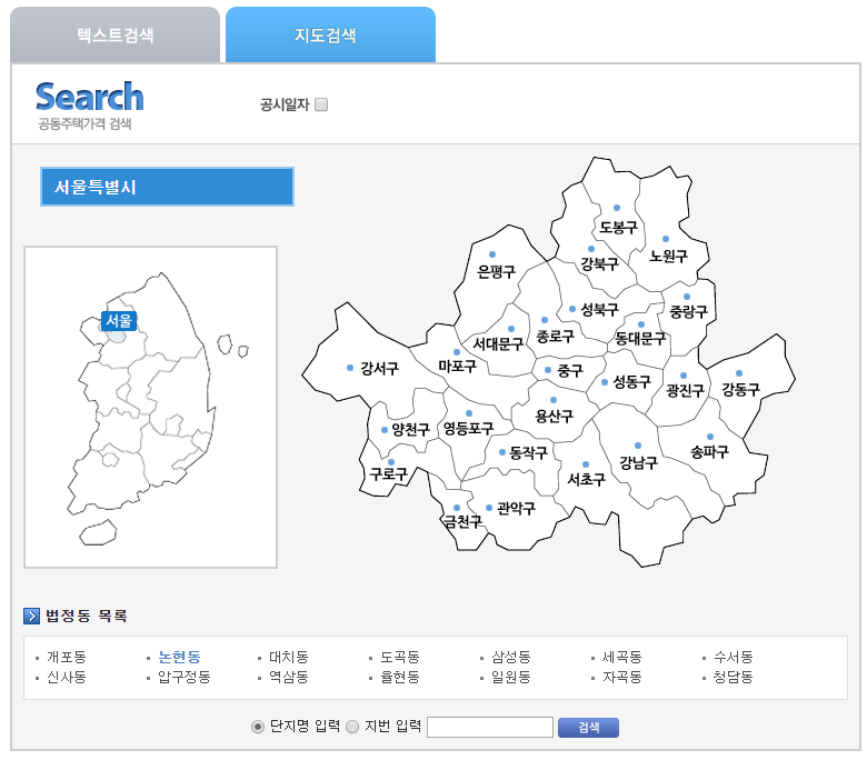 공시지가 조회 방법은 두 가지가 있는데, 시/도 선택부터 세부 주소 입력을 통해 조회하는 텍스트 검색방법이 경우에 따라서는 더 익숙하실 수 있겠습니다.