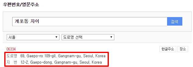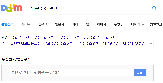 먼저 포털 사이트 검색창에서 영문주소 변환이라고 검색하면 위처럼 빈 칸에 한글로 주소를 적으면 바로 영문주소로 변환해주는 기능을 합니다.