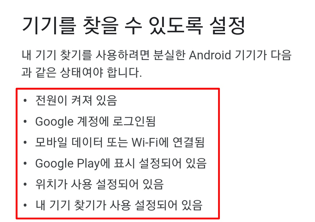 구글 핸드폰 위치추적을 하기 위한 조건으로 구글 고객센터에서는 위와 같이 설명하고 있습니다. 위의 조건들 중 하나라도 충족이 안된다면 정확한 위치추적을 할 수가 없습니다.